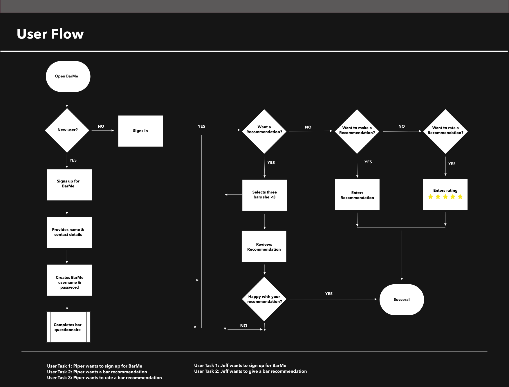 I based the user journey on Piper’s primary goal when using the app — to get a bar recommendation. I mapped out Piper’s behavioral flow based on both a “typical” and an “atypical” journey to better understand how users would successfully navigate through the app and where pain-points might arise.